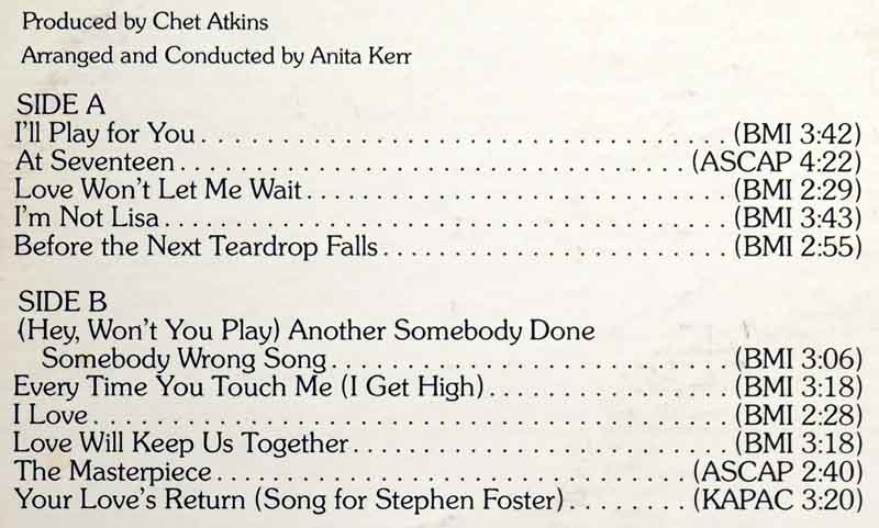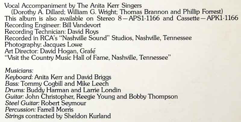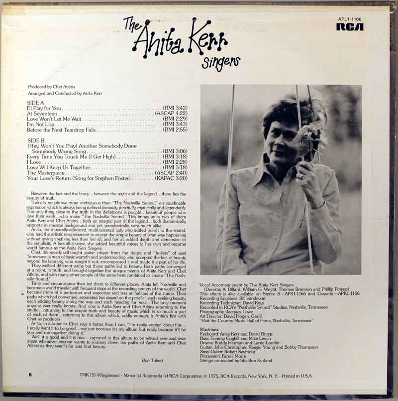 プロデューサーは、RCAからリリースされたアニタ・カーのアルバムほぼ全てを手がけた、チェット・アトキンス(Chet Atkins)。ナッシュビル・シンガーズは、アルトのドティー・ディラード(Dottie Dillard)、テナーのギル・ライト(Gil Wright)、ベースは定番のルイ・ナンリー(Louis Nunley)ではなく、トーマス・ブラノン(Thomas Brannon)、フィリップ・フォレスト(Phillip Forrest)、二人ともナッシュビルを拠点にアニタ・カーのアルバムに参加しています。収録を前に、アニタがチェットへの手紙で「興奮している。あなたとのアルバムを本当に良いものにしたいと思っている」としたためたと、ライナー・ノーツにあります。ナッシュビルの盟友たちとの10年ぶりの収録は、大きな記念碑となりました。シールズ&クロフツのファンである私のなかでも、アルバムの存在感がグッと増してきました。