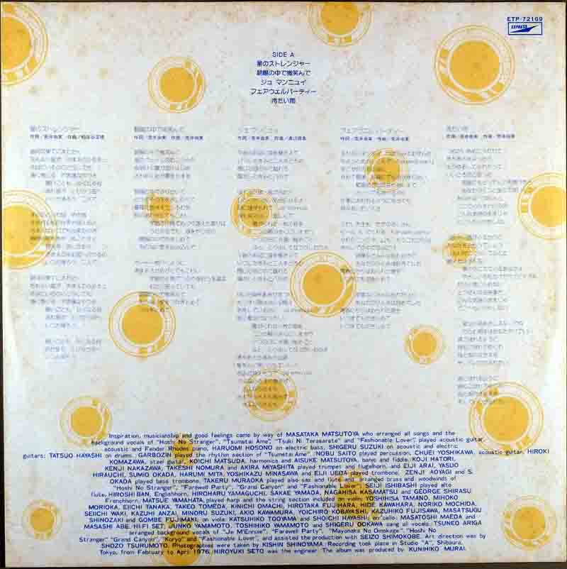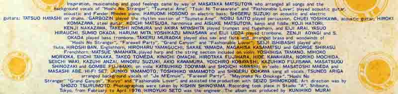 『Inspiration, musicianship and good feelings came by way of MASATAKA MATSUTOYA who arranged all songs and the background vocals of "Hoshi No Stranger", "Tsumetai Ame", "Tsuki Ni Terasarete" and "Fashionable Lover", played acoustic guitar, acoustic and Fender Rhodes piano』