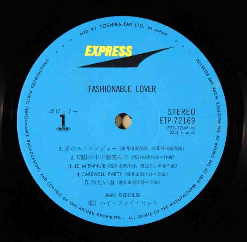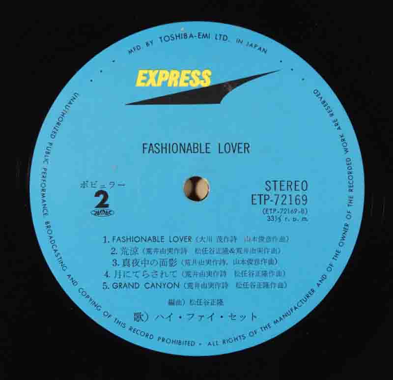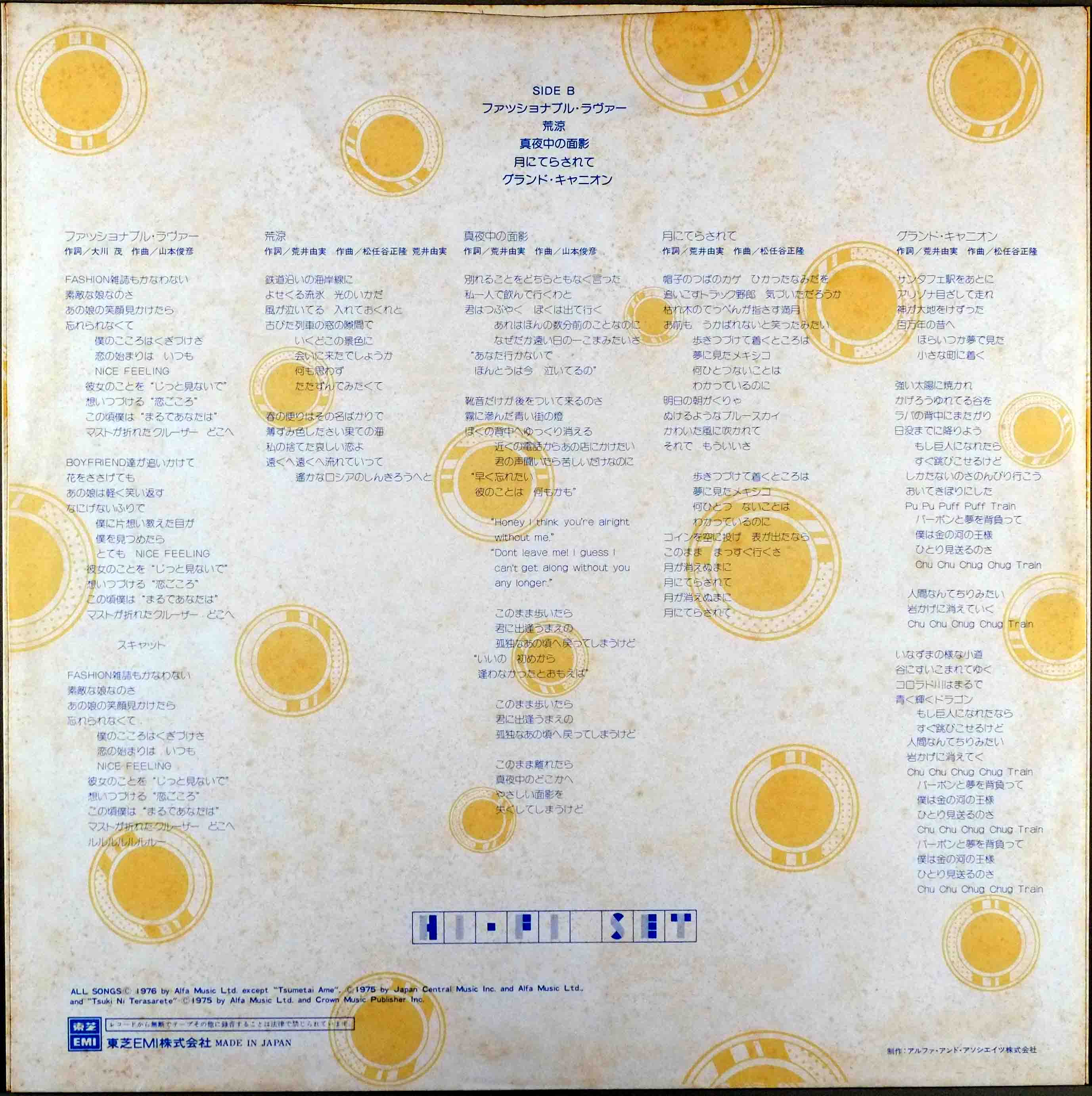 冗長になるので全て訳すのは止めておきますが、アルバム全体のコンセプト、アレンジは松任谷正隆が担当したと強調されています。その他でも、全10曲中ほぼ全ての9曲で荒井由実が作詞。作曲は荒井由実4曲、松任谷正隆4曲。前年(75年)12月に2人は婚約。そしてバックもティン・パン・アレーの仲間、細野晴臣(エレクトリック・ベース)、鈴木茂(アコースティック&エレクトリック・ギター)、林立夫(ドラム)など、松任谷ファミリーで固め蜜月関係そのもののアルバム制作だったことは想像に難くありません。そのなかで、作詞・大川茂、作曲・山本俊彦のゴールデンコンビによるアルバムタイトル曲『(B1) ファッショナブル・ラヴァー(Fashionable Lover)』が光ります。