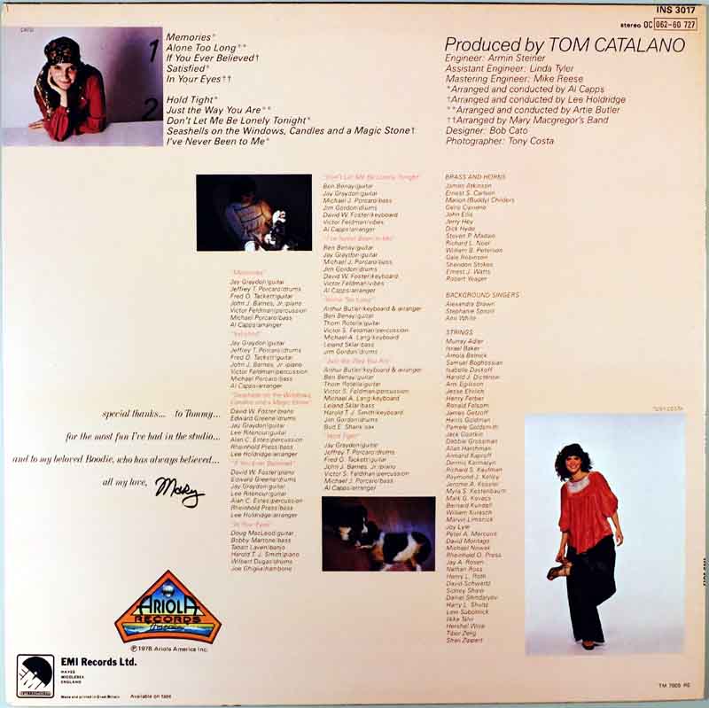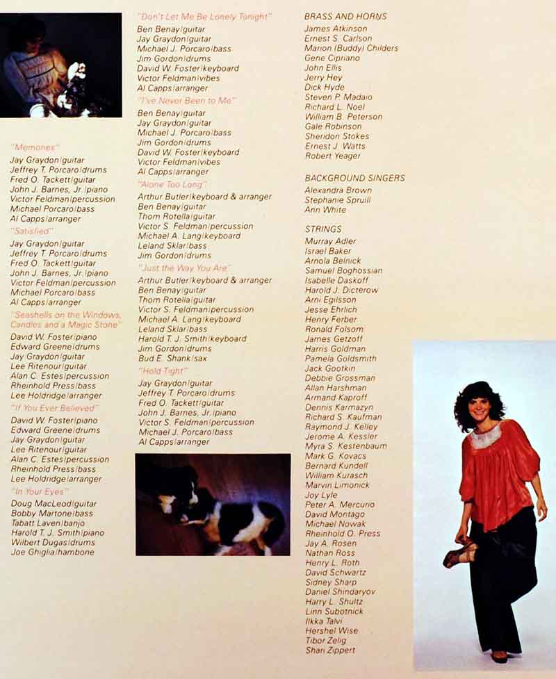 上はジャケット裏の共演者のリストです。デビュー・アルバムの成功もあったと思いますが、その人数と豪華さに驚きます。ピアノ、キーボードでデイヴィッド・フォスター(David Foster)、サックスでバド・シャンク(Bud Shank)の名前も見えます。