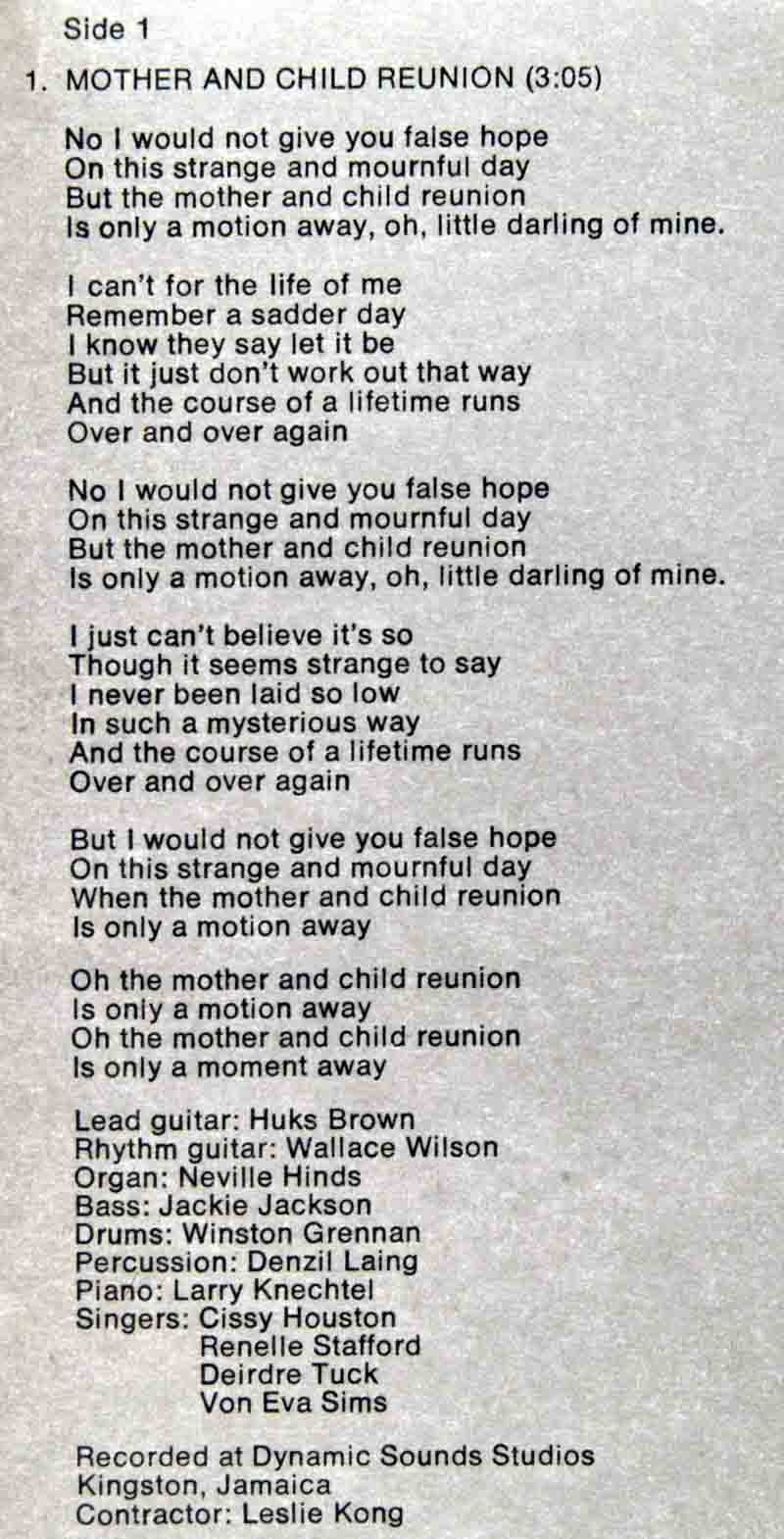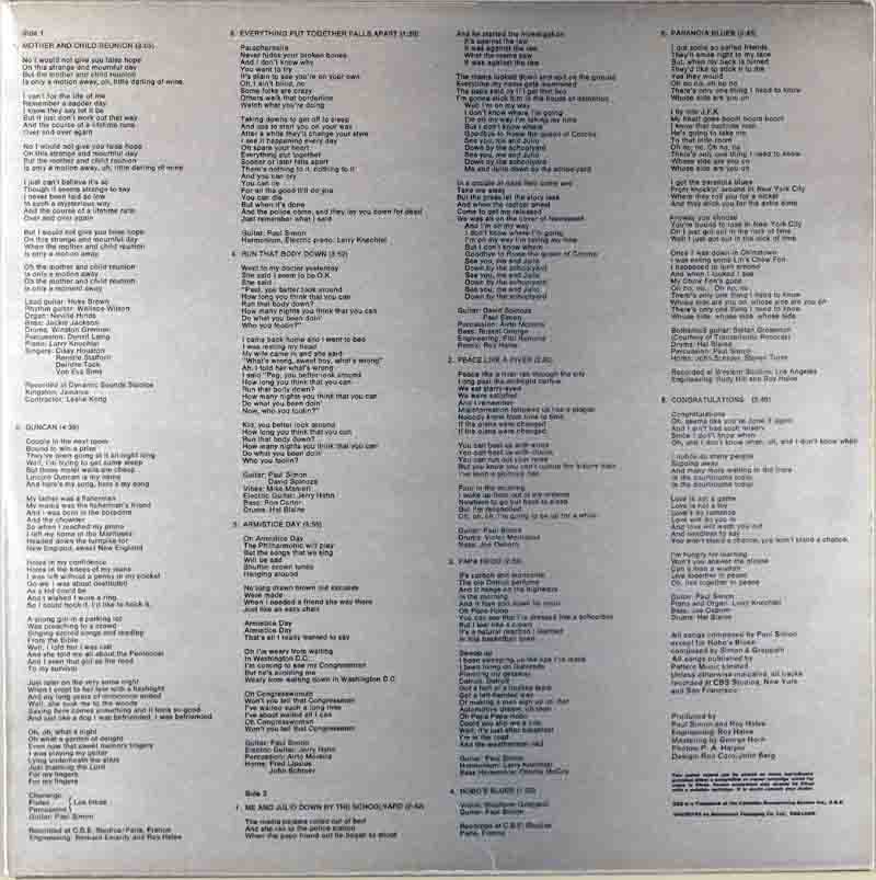 サイモン&ガーファンクルの端正なフォーク・ロック路線から一転、『(A1) 母と子の絆(Mother And Child Reunion)』のレゲエ・ミュージックの衝撃。インナースリーブに掲載されている歌詞と録音データを以下に拡大しています。