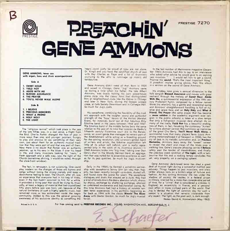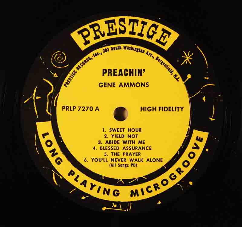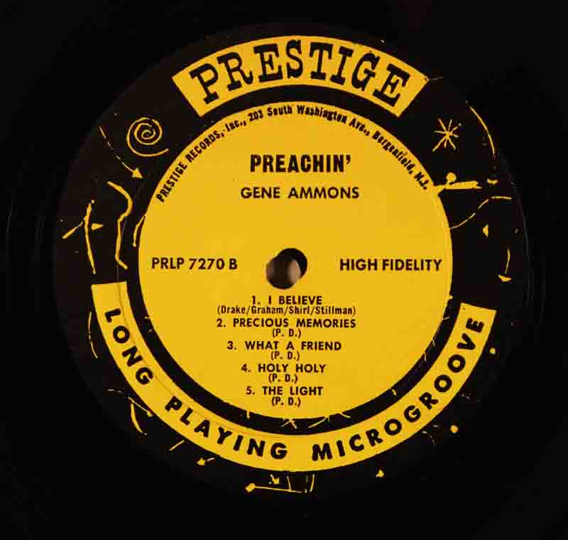 内容も思った通り珍品。最後の曲目リストにある通り、JAZZレコードらしからぬ収録曲の多さ。最短が『(A2) Yield Not』の2分01秒。最長でも『(B2) Precious Memories』の4分11秒。1曲1曲があっという間に終わっていく印象ですが、繰り返し何度も何度も聴いていたい心地良さ。タイトルの『プリィーチィン(Preachin')』は、「説教」「説教を伴う礼拝」といった意味で、本アルバムはジーン・アモンズのテナーによる賛美歌集なのです。