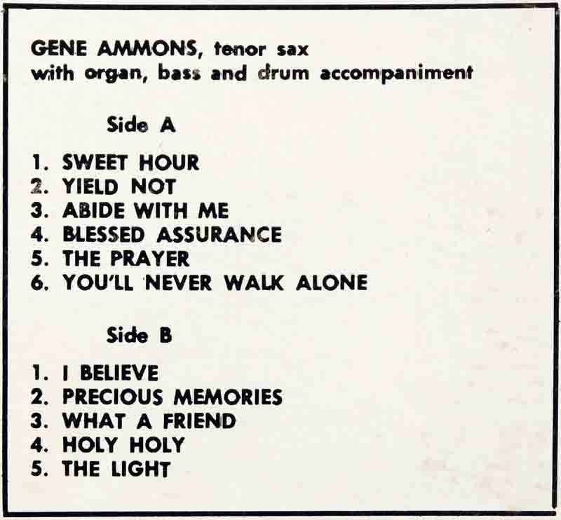 ジャケット裏のプログラム部分を拡大してみました。「GENE AMMONS, tenor sax with organ, bass and drum accompaniment」で「伴奏はオルガン、ベース、ドラム」とだけ記され、伴奏者の名前がありません。ウィキペディアに、オルガンはクラレンス・アンダーソン(Clarence "Sleepy" Anderson)。ベースがシルベスター・ヒックマン(Sylvester Hickman)。ドラムはドラル・アンダーソン(Dorral Anderson)と記されていました。テナーのソロを、静かにサポートするだけの演奏。名前の記載が無いこともうなずけます。硬派のジャズファンには見向きもされないアルバムと思いますが、私にとっては普段聴きの宝物です。