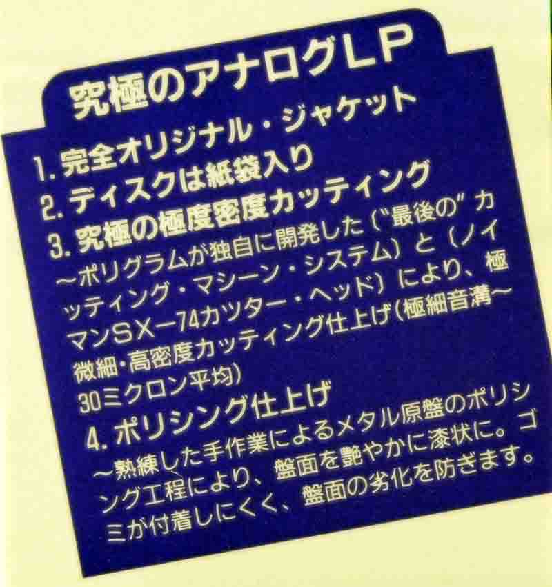 脱線ばかりで申しわけありません。本盤と同シリーズのアルバム・タイトルが帯にあるので、高音質な日本盤の手掛かりとして、少し冗長ですが画像を掲載しておきます。