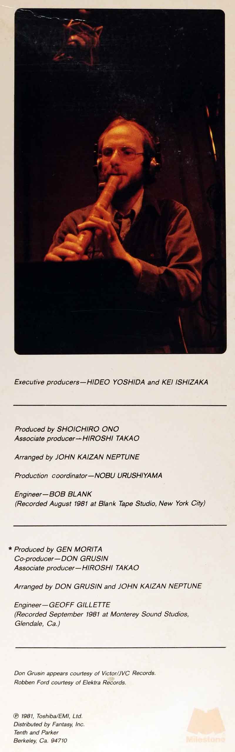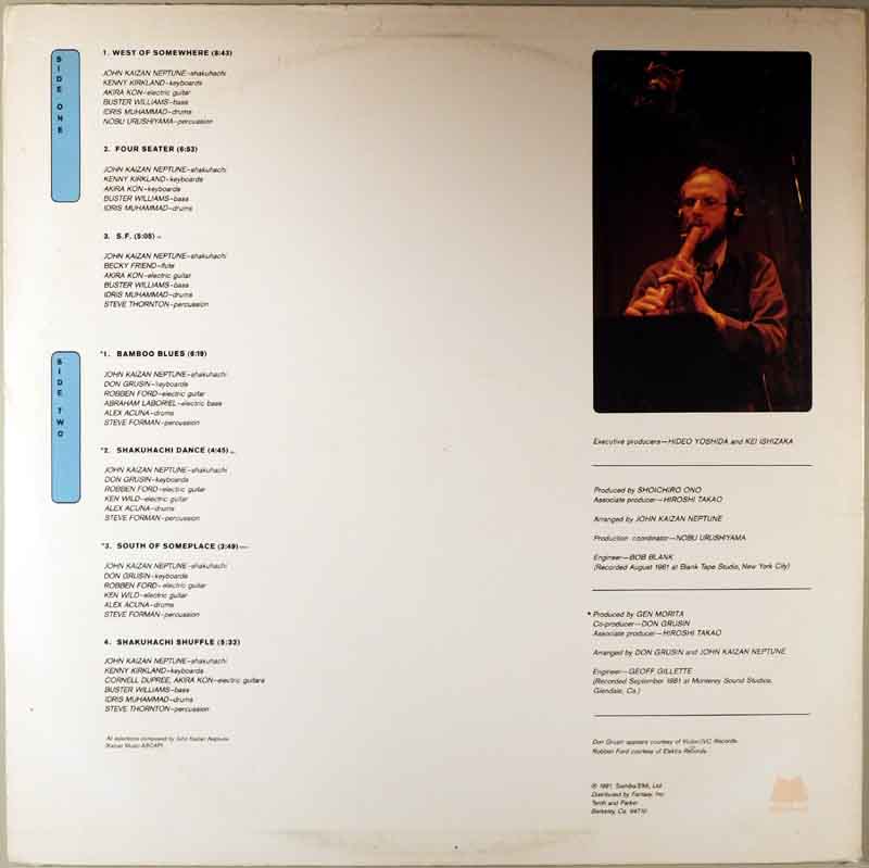 上にジャケット、下にレコード盤レーベルの表裏を並べています。本盤は彼の通算6枚目のアルバム。海山(かいざん)の尺八をフィーチャーしたインストルメンタル。尺八がリードなのに、軽みのあるウエストコースト・ジャズの印象でテンポよい楽曲が並びます。