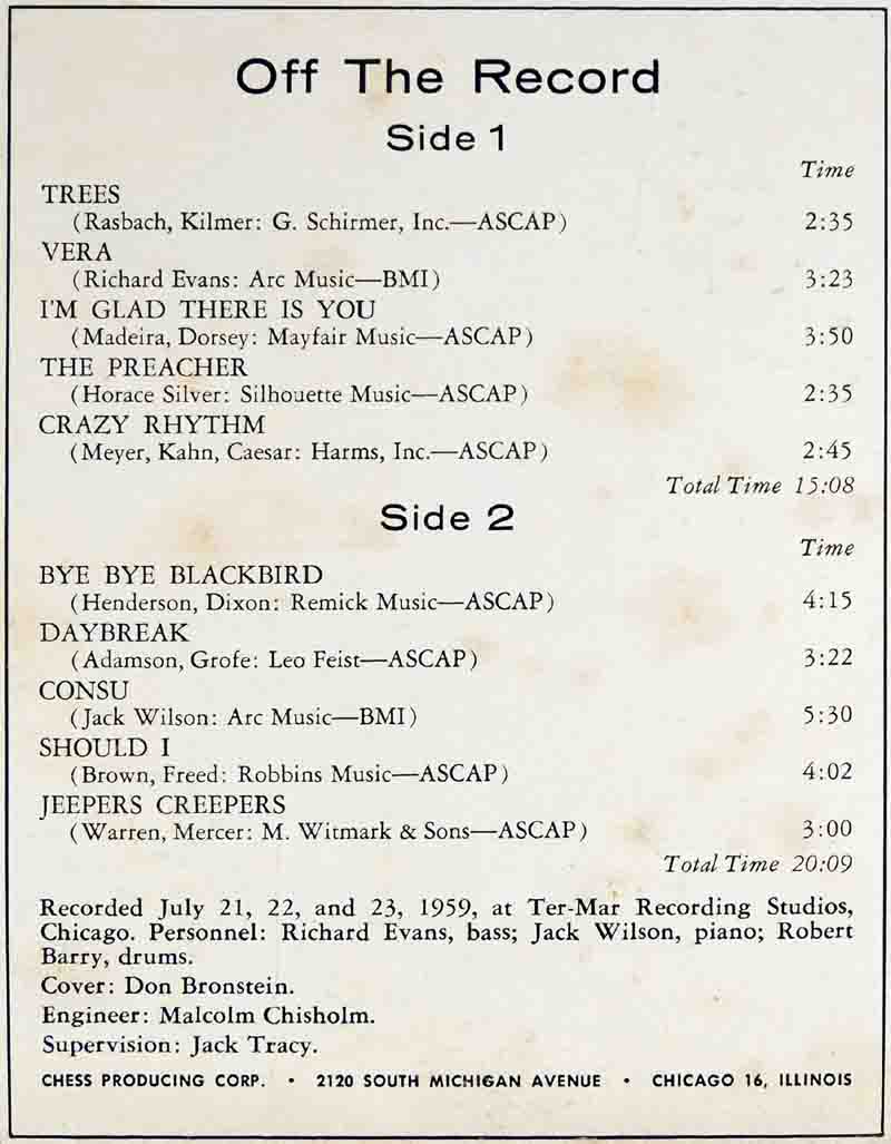 最近まで、リーダのリチャード・エヴァンスのピアノと思い込んでいました。録音データを見て、彼のパートはベースと知って驚き、またもや不明の至りを露呈。ピアノはジャック・ウィルソン(Jack Wilson)、軽快なドラムはロバート・バリー(Robert Barry)。