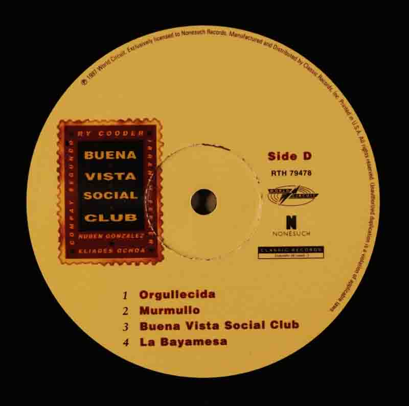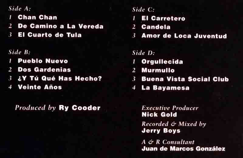 ジャケット裏の曲目&制作データです。制作統括にライ・クーダーの名前があります。これもウィキペディアからの情報ですが、ライ・クーダーがキューバに旅行した際、それまでキューバ国外にはほとんど知られていなかった老ミュージシャンとセッションを行ったことがきっかけでアルバムが作られます。バンド名は、作品に参加したミュージシャンの大半が、1940年代のキューバに実在した音楽クラブ『ブエナ・ビスタ・ソシアル・クラブ』の会員だったことから名づけられました。
