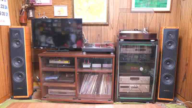 雑然としていますが、私のオーディオとAVシステムの写真です。6畳の洋間の一辺を占めています。どかして撮影したので写っていませんが、いつも手前にテーブルが置かれ、そこで三度の食事をとります。鍋の蒸気、ホットプレートの鉄板焼きで油が飛び散り、卓上炭焼きコンロで灰が舞ったりするので、普段はスピーカーとレコードプレーヤーに布のカバーをしています。このようにカバーを取るのはじっくり構えて聴くときだけで、カバーを掛けたまま聴き流しすることがほとんどです。
